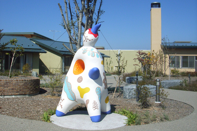 この施設は主に重症心身障害者や肢体不自由児が治療と日常生活を送るための施設である。自然豊かな山に囲まれた敷地の中で、この施設で生活する子供たちのためのアートワークが計画された。作家・杉山知子は、子供たちがわくわくし、近づいてみたくなるアートや触ったり交わったりすることができる五感を楽しませるアートを軸に、4点の作品を制作、屋外に設置した。”あけぼん”と名づけられたシンボルオブジェから、アートベンチまでユニークで愛らしい作品が場を和やかな雰囲気に演出している。