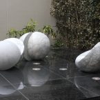 また桜並木の散策歩道に沿って配置された石彫作品(Kai-Studio/上田快・亜矢子)は見る人の想像力を掻き立てる。子供たちは思い思いに座ったり遊んだり、アートと共にすっかり風景の一部となっている。