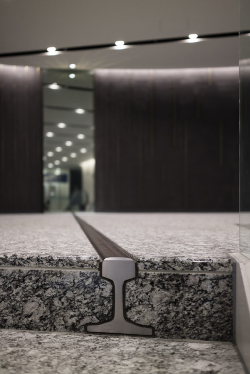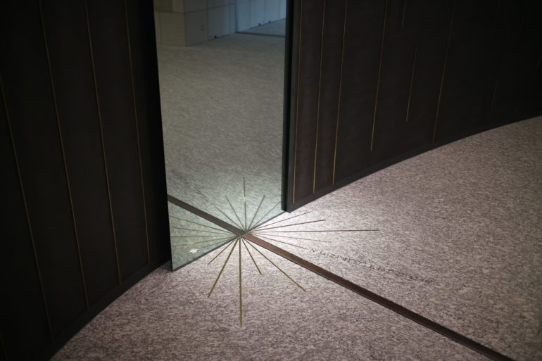 ガラスに映り込む星の地点の緯度経度の座標は、世界にたった一つの、日本生命と広島電鉄ゆかりの土地の座標である。床には広島電鉄を象徴するレールが埋め込まれ、ガラスの向こうまで伸びているように映り、ハーフミラーガラスに映り込む真鍮は、星(日本生命)を形作った。手仕事で仕上げられた黒い曲面の左官壁には、0.01秒ごとの経線が立ち上がり、長短の真鍮のラインで目盛りが刻まれている。この作品は、その星の座標点を「現在」と見立て、この土地で変わりなく人々を支えてゆく二社の、過去から現在、そして未来へと続く道のりを現す。
